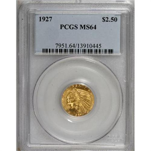 <B>1927 $2 1/2 MS64 PCGS.</B></I> An enticing lemon-gold example of this popular Roaring Twenties type issue, pleasingly detailed with only faint, incidental flaws on the obverse. A few minor abrasions are present in the reverse fields.<BR><BR><B>Coin Engraver:</B> Bela Lyon Pratt<BR><BR><b>Shipping:</b> Coins & Currency (<a target="_blank" href="http://www.heritageauctions.com/common/shipping.php">view shipping information</a>)