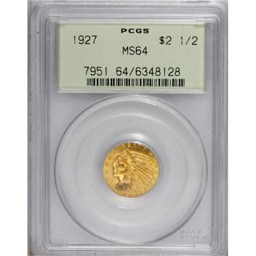 <B>1927 $2 1/2 MS64 PCGS.</B></I> The flashy lemon-gold surfaces lack mentionable marks, while the exactingly struck devices are well preserved. In an old green label holder.<BR><BR><B>Coin Engraver:</B> Bela Lyon Pratt<BR><BR><b>Shipping:</b> Coins & Currency (<a target="_blank" href="http://www.heritageauctions.com/common/shipping.php">view shipping information</a>)