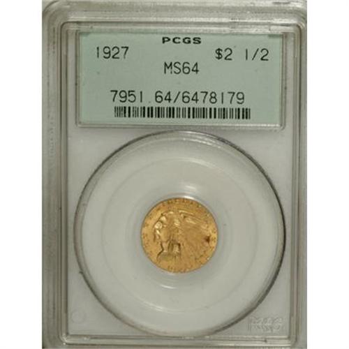 <B>1927 $2 1/2 MS64 PCGS.</B></I> Deep sun-gold toning enlivens this lustrous and alertly struck near-Gem. An alloy spot is concealed on the back border of the headdress. Encapsulated in an old green label holder.<BR><BR><B>Coin Engraver:</B> Bela Lyon Pratt<BR><BR><b>Shipping:</b> Coins & Currency (<a target="_blank" href="http://www.heritageauctions.com/common/shipping.php">view shipping information</a>)