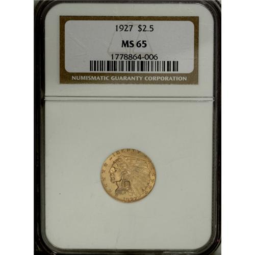 <B>1927 $2 1/2 MS65 NGC.</B></I> A lovely peach and yellow-gold Gem that benefits from shimmering luster and an above average strike. Even inconsequential contact is difficult to find despite the aid of a loupe. A handsome type coin for the advanced gold collection. NGC and PCGS combined have certified just 22 pieces finer (11/06).<BR><BR><b>Shipping:</b> Coin/Currency (<a target="_blank" href="http://www.heritageauctions.com/common/shipping.php">view shipping information</a>)