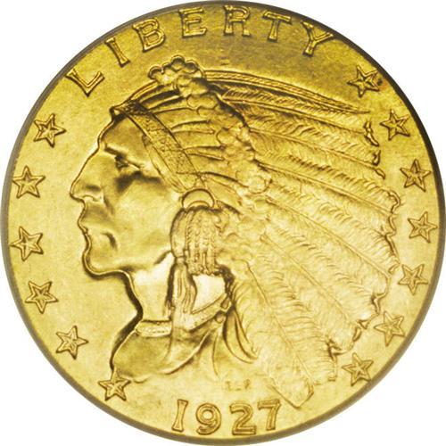 <B>1927<$2 1/2> MS65 PCGS.</B></I> A well-struck, lustrous Gem, with attractive peach-gold color. The surfaces have a minimum of abrasions, as would be expected from the assigned grade, and none are individually distracting. A couple of minor alloy spots are noted on the reverse. Very difficult to find nicer.