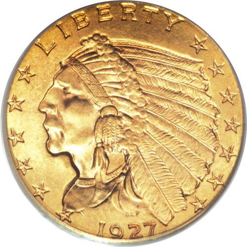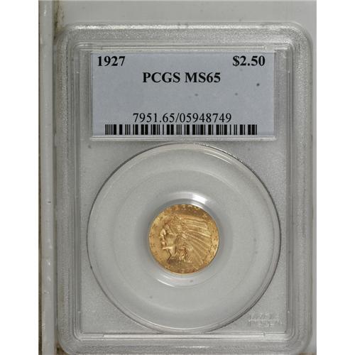 <B>1927 $2 1/2 MS65 PCGS.</B></I> The 1927 is one of the better produced and attractive dates in the Indian Head quarter eagle series. A powerful strike manifests itself in sharp definition on the Indian's hair and bonnet feathers, and on the eagle's plumage. Beautiful apricot-gold patination is a shade deeper on the reverse, and both sides reveal tinges of light green. Highly lustrous and well preserved.<BR><BR><b>Shipping:</b> Coins & Currency (<a target="_blank" href="http://www.heritageauctions.com/common/shipping.php">view shipping information</a>)