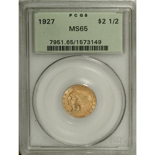 <B>1927 $2 1/2 MS65 PCGS.</B></I> This charming Gem, certified in a green-label holder, offers bicolor orange-gold and hazel-gray surfaces with glowing luster. Despite the mintage totaling nearly 400,000 pieces this issue is elusive any finer, as PCGS has certified only 16 such coins (4/07).<BR><BR><b>Shipping:</b> Coins & Currency (<a target="_blank" href="http://www.heritageauctions.com/common/shipping.php">view shipping information</a>)
