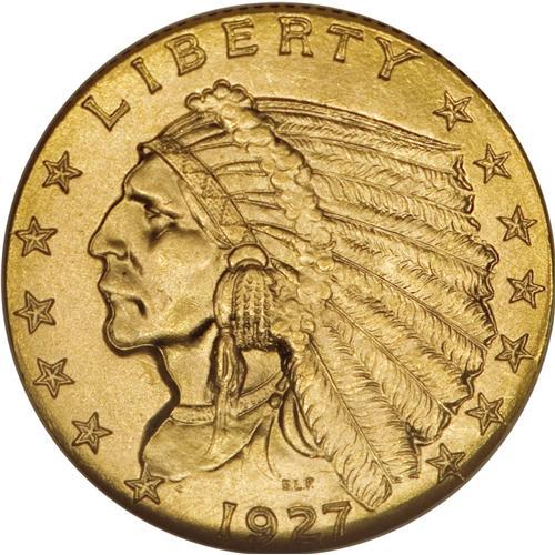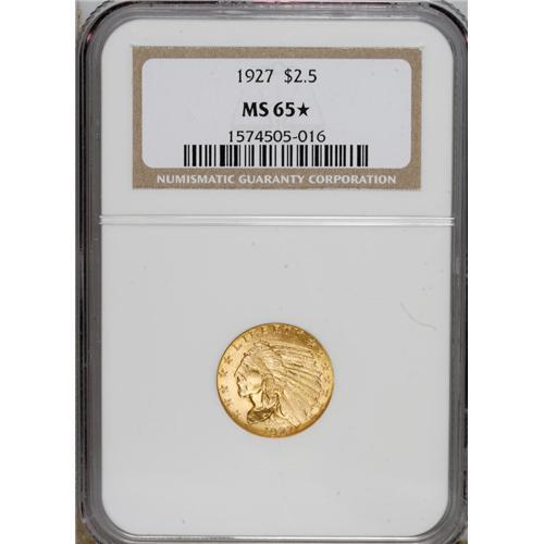 <B>1927 $2 1/2 MS65 <img border='0' src='http://www.heritagecoins.com/images/star.gif' width=10 height=10> NGC.</B></I> Now here is a coin you do not see every day: an Indian Head quarter eagle with brassy-gold color and radiant luster, more typical of a Liberty Head quarter eagle in high grade. This bold combination fully merits the coveted Star designation awarded by NGC for superior eye appeal, as this coin is truly extraordinary. The strike is equally impressive, with full articulation of even the lowest headdress feathers and the necklace. A couple of minor obverse abrasions, in the fields and on the cheek, account for the grade. While there are numerically finer examples, a piece with finer aesthetics is highly unlikely.<BR><BR><b>Shipping:</b> Coins & Currency (<a target="_blank" href="http://www.heritageauctions.com/common/shipping.php">view shipping information</a>)
