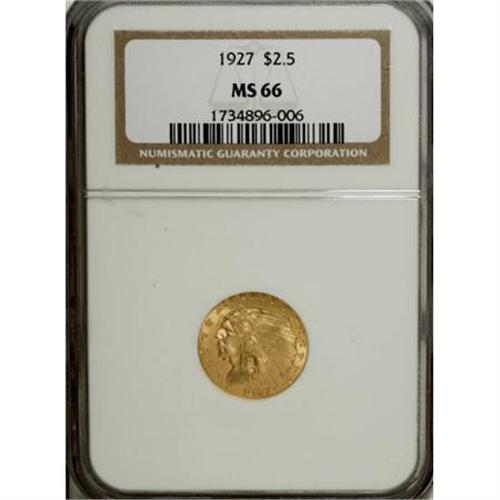 <B>1927 $2 1/2 MS66 NGC.</B></I> While the 1927 shares its relative availability with the other quarter eagle issues of the 1920s, in grades above Gem, this issue is considerably more challenging than its 1925-D or 1926 counterparts, with MS66 the highest grade awarded by either NGC or PCGS (7/07). Garrett and Guth (2006) comment on the elusive nature of finer pieces: "If one desires the lofty (and current top) grade of MS66, substantial patience will likely be required as a few years may pass between offerings of this condition rarity ... "<BR> With the present piece up for sale, what collectors need now is not patience, but a willingness to bid. This amazing Premium Gem exhibits uncommonly vibrant luster and strong detail. The shining sun-gold and orange-gold surfaces are free of mentionable distractions, and the coin's eye appeal is breathtaking. In sum, a simply wonderful representative.<BR><BR><B>Coin Engraver:</B> Bela Lyon Pratt<BR><BR><b>Shipping:</b> Coins & Currency (<a target="_blank" href="http://www.heritageauctions.com/common/shipping.php">view shipping information</a>\)