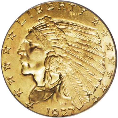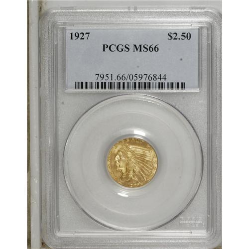 <B>1927 $2 1/2 MS66 PCGS.</B></I> It has been nearly twelve years since Heritage has had the privilege to offer a 1927 quarter eagle in an MS66 grade, and this lustrous Gem may have been worth the wait. Honey-gold, with the merest trace of lime on the reverse, this beauty boasts an absolute minimum of distracting surface marks, and certainly nothing that would interfere with the assigned grade. A tiny nick between the M and the eagle's leg might best serve as a pedigree marker. Unsurpassed at either major grading service, and a coin that is undoubtedly destined for an outstanding date set of Indian quarter eagles. Population: 15 in 66, 0 finer (1/07).<BR><BR><b>Shipping:</b> Coins & Currency (<a target="_blank" href="http://www.heritageauctions.com/common/shipping.php">view shipping information</a>)