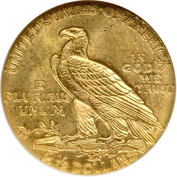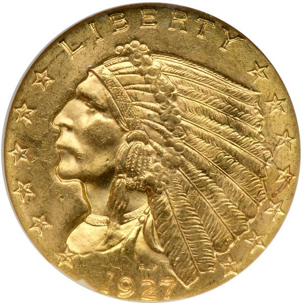 1927 $2.50 Indian. NGC graded MS-65. Frosty and untoned. Intensely blazing luster explodes like a golden fire storm on the gleaming, brilliant surfaces of this above-average gem. A blaze of frosty gold highlights the topmost feathers on the Indian's portrait, with similar splashes on the eagle on the reverse. Pop 379; 9 finer in 66 (PCGS # 7951) .