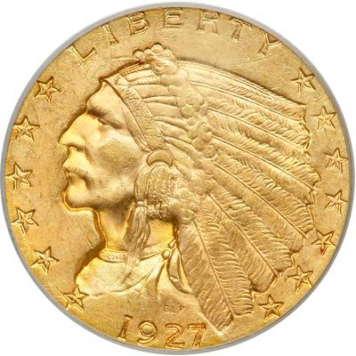 1927 $2.50 Indian. PCGS graded MS-63. Nice light toning. A frosty coin that has an outstanding strike and fresh-off-the-dies sheen (PCGS # 7951).
