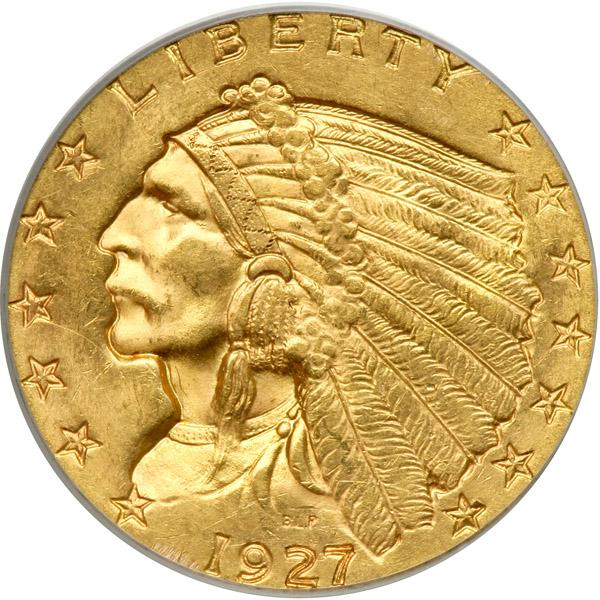 1927 $2.50 Indian. PCGS graded MS-63. Choice and frosty with honey color gold surfaces (PCGS # 7951) .