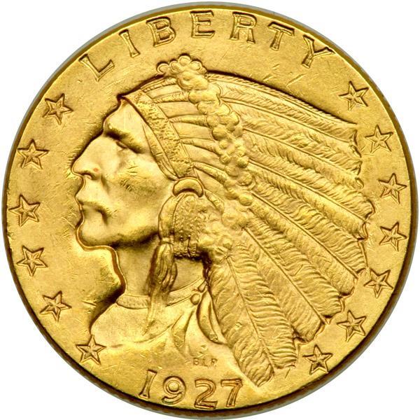 1927 $2.50 Indian. PCGS graded MS-64. Nice and frosty, the surface quality is extra choice for the grade. We note only a few small ticks on the cheekbone of the Indian (PCGS # 7951) .