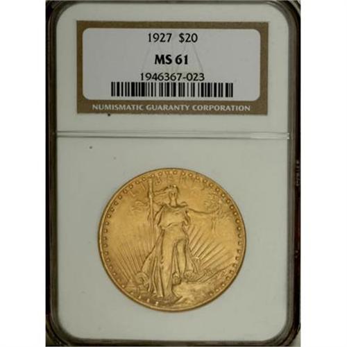 <B>1927 $20 MS61 NGC.</B></I> NGC Census: (2787/109398). PCGS Population (3958/108687). Mintage: 2,946,750. Numismedia Wsl. Price for NGC/PCGS coin in MS61: $1,020. (#9186)<BR><BR><B>Coin Engraver:</B> Augustus Saint-Gaudens<BR><BR><b>Shipping:</b> Coins & Currency (<a target="_blank" href="http://www.heritageauctions.com/common/shipping.php">view shipping information</a>)
