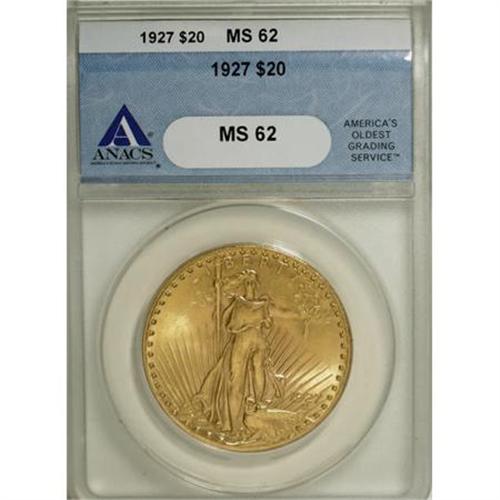 <B>1927 $20 MS62 ANACS.</B></I> NGC Census: (14869/93050). PCGS Population (17652/88657). Mintage: 2,946,750. Numismedia Wsl. Price for NGC/PCGS coin in MS62: $895. (#9186)<BR><BR><B>Coin Engraver:</B> Augustus Saint-Gaudens<BR><BR><b>Shipping:</b> Coins & Currency (<a target="_blank" href="http://www.heritageauctions.com/common/shipping.php">view shipping information</a>)