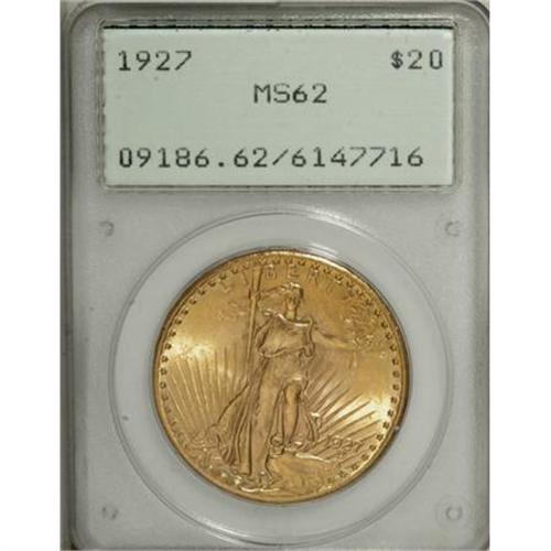 <B>1927 $20 MS62 PCGS.</B></I> PCGS Population (17553/82137). NGC Census: (14595/91042). Mintage: 2,946,750. Numismedia Wsl. Price for NGC/PCGS coin in MS62: $735. (#9186)<BR><BR><B>Coin Engraver:</B> Augustus Saint-Gaudens<BR><BR><b>Shipping:</b> Coins & Currency (<a target="_blank" href="http://www.heritageauctions.com/common/shipping.php">view shipping information</a>\)