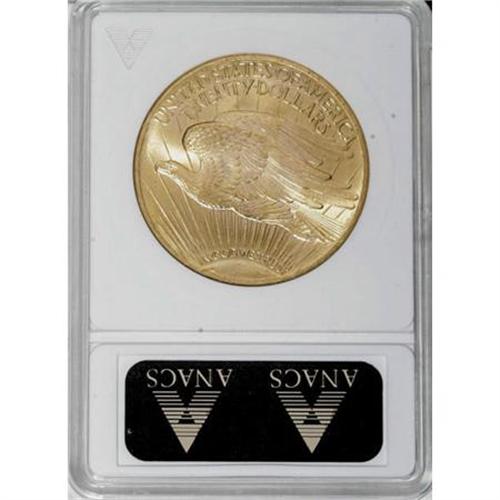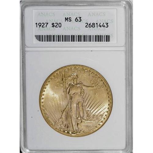 <B>1927 $20 MS63 ANACS.</B></I> NGC Census: (31196/59846). PCGS Population (31434/50703). Mintage: 2,946,750. Numismedia Wsl. Price for NGC/PCGS coin in MS63: $790. (#9186)<BR><BR><B>Coin Engraver:</B> Augustus Saint-Gaudens<BR><BR><b>Shipping:</b> Coins & Currency (<a target="_blank" href="http://www.heritageauctions.com/common/shipping.php">view shipping information</a>\)