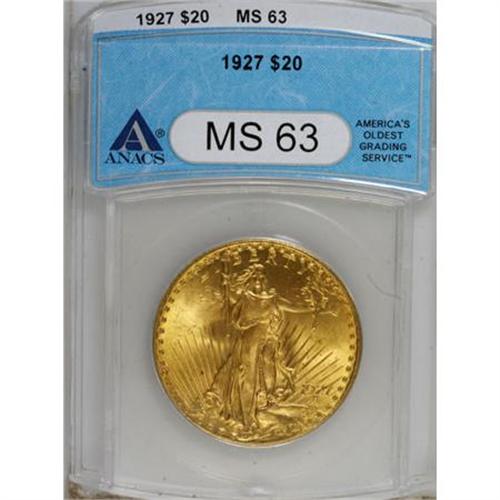<B>1927 $20 MS63 ANACS.</B></I> NGC Census: (31415/60417). PCGS Population (31701/54101). Mintage: 2,946,750. Numismedia Wsl. Price for NGC/PCGS coin in MS63: $785. (#9186)<BR><BR><B>Coin Engraver:</B> Augustus Saint-Gaudens<BR><BR><b>Shipping:</b> Coins & Currency (<a target="_blank" href="http://www.heritageauctions.com/common/shipping.php">view shipping information</a>)