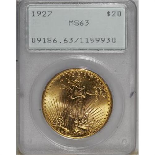 <B>1927 $20 MS63 PCGS.</B></I> PCGS Population (32288/58650). NGC Census: (32383/61879). Mintage: 2,946,750. Numismedia Wsl. Price for NGC/PCGS coin in MS63: $1,100. (#9186)<BR><BR><B>Coin Engraver:</B> Augustus Saint-Gaudens<BR><BR><b>Shipping:</b> Coins & Currency (<a target="_blank" href="http://www.heritageauctions.com/common/shipping.php">view shipping information</a>)