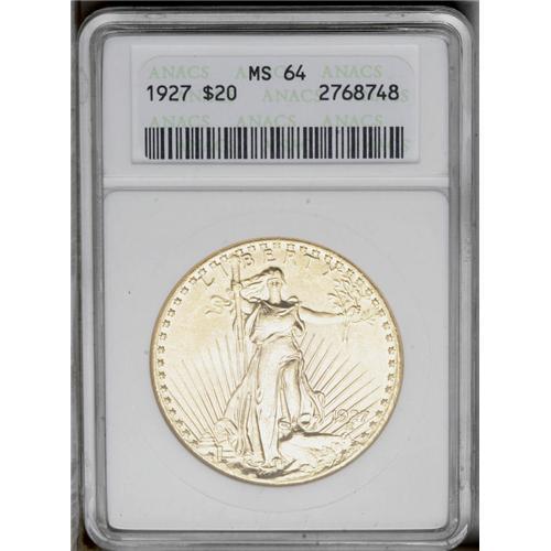 <B>1927<$20> MS64 ANACS.</B></I> Highly lustrous with rich gold toning, a few wispy field marks, and a moderate blemish on Liberty's breast. This P-mint issue is the second most common date in the Saint-Gaudens series of double eagles.