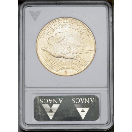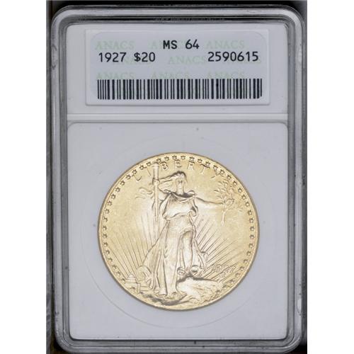 <B>1927<$20> MS64 ANACS.</B></I> Richly toned and minimally marked, for the grade, with typically bold details and flashy, effulgent luster. A medium-sized red-orange alloy spot rests over the center of the sun, near the lower reverse rim. A lovely near-Gem.