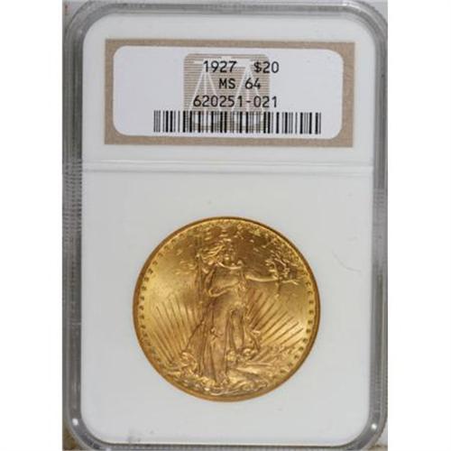 <B>1927 $20 MS64 NGC.</B></I> NGC Census: (42314/17532). PCGS Population (30788/19915). Mintage: 2,946,750. Numismedia Wsl. Price for NGC/PCGS coin in MS64: $890. (#9186)<BR><BR><b>Shipping:</b> Coins & Currency (<a target="_blank" href="http://www.heritageauctions.com/common/shipping.php">view shipping information</a>)