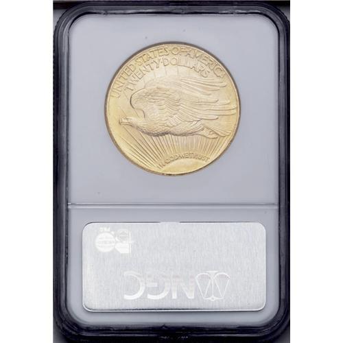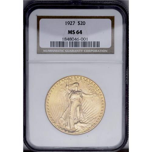 <B>1927<$20> MS64 NGC.</B></I> Radiant luster adorns apricot-gold surfaces that display occasional subtle hints of pink. The design elements tend to be adequately defined, and some light surface and rim marks define the grade.