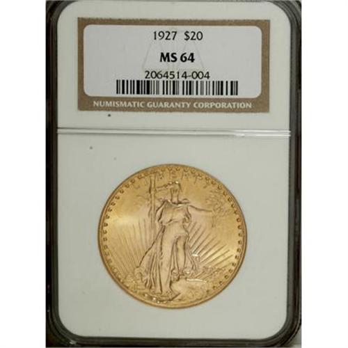 <B>1927 $20 MS64 NGC.</B></I> NGC Census: (43414/18194). PCGS Population (34187/23908). Mintage: 2,946,750. Numismedia Wsl. Price for NGC/PCGS coin in MS64: $1,210. (#9186)<BR><BR><B>Coin Engraver:</B> Augustus Saint-Gaudens<BR><BR><b>Shipping:</b> Coins & Currency (<a target="_blank" href="http://www.heritageauctions.com/common/shipping.php">view shipping information</a>)