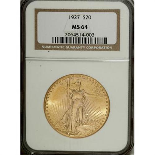 <B>1927 $20 MS64 NGC.</B></I> NGC Census: (43414/18194). PCGS Population (34187/23908). Mintage: 2,946,750. Numismedia Wsl. Price for NGC/PCGS coin in MS64: $1,210. (#9186)<BR><BR><B>Coin Engraver:</B> Augustus Saint-Gaudens<BR><BR><b>Shipping:</b> Coins & Currency (<a target="_blank" href="http://www.heritageauctions.com/common/shipping.php">view shipping information</a>)