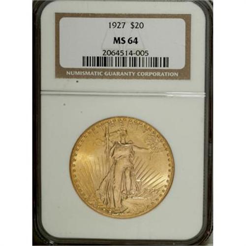 <B>1927 $20 MS64 NGC.</B></I> NGC Census: (43414/18194). PCGS Population (34187/23908). Mintage: 2,946,750. Numismedia Wsl. Price for NGC/PCGS coin in MS64: $1,210. (#9186)<BR><BR><B>Coin Engraver:</B> Augustus Saint-Gaudens<BR><BR><b>Shipping:</b> Coins & Currency (<a target="_blank" href="http://www.heritageauctions.com/common/shipping.php">view shipping information</a>)