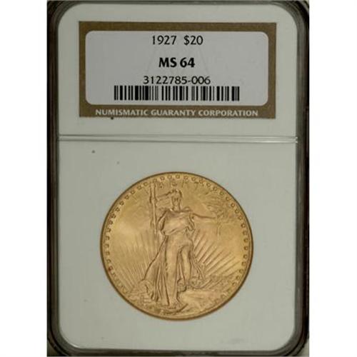 <B>1927 $20 MS64 NGC.</B></I> NGC Census: (43535/18243). PCGS Population (34496/24154). Mintage: 2,946,750. Numismedia Wsl. Price for NGC/PCGS coin in MS64: $1,210. (#9186)<BR><BR><B>Coin Engraver:</B> Augustus Saint-Gaudens<BR><BR><b>Shipping:</b> Coins & Currency (<a target="_blank" href="http://www.heritageauctions.com/common/shipping.php">view shipping information</a>)