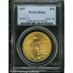 1927 $20 MS64 PCGS. Cartwheel luster overwhelms th <B>1927 $20 MS64 PCGS.</B></I> Cartwheel luster overwhelms the undisturbed fields of this intricately struck and attractive straw-gold Double Eagle. <BR><BR><B>Important notice:</B> Heritage usually auctions material at the rate of 200-250 lots per hour. On some occasions eBay Live bid software or the Internet may not be able to keep up with the pace of the auction. We recommend placing a realistic absentee bid now as insurance to avoid disappointment. Occasionally the auctioneer may eliminate or reject an eBay Live bid, and the auctioneer may also reopen a lot after the close of the eBay live bidding (usually because we missed an audience bid), and may reject your bid even if it shows you as the winning bidder. By bidding via eBay Live, you agree that Heritage may award the lot to another bidder at its sole discretion under the circumstances described above or any other reasonable circumstances. Since eBay bids are not shown to us until we open the lot on the floor, we treat those bids just like floor bids. In most cases the floor responds before the eBay bid is presented to us, due to Internet lag time, so for consistency we have made it a policy that floor bids are always considered first over tie eBay live bids. Also please note that all Heritage lots purchased through eBay Live carry a 20% Buyer's Premium. Please make sure you read the Terms and Conditions before you bid. This lot is being auctioned in conjunction with a live floor auction by Heritage Galleries & Auctioneers. All final auction and invoice information will be supplied by Heritage Galleries & Auctioneers, and all other information should be considered preliminary. Lot:7248