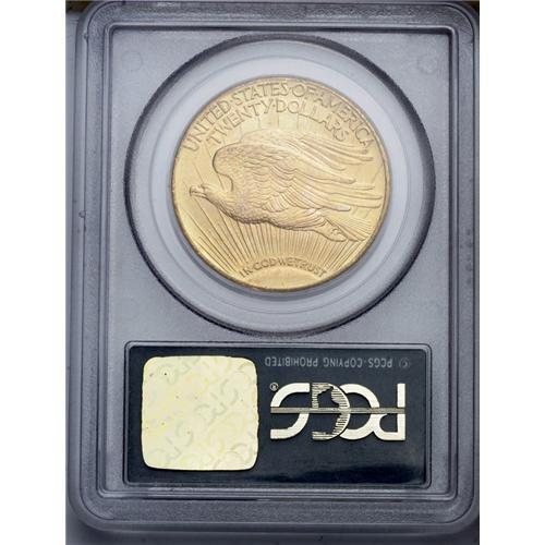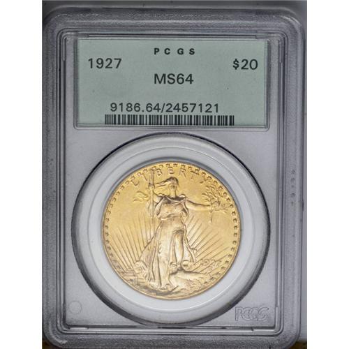 <B>1927<$20> MS64 PCGS.</B></I> Deep apricot toning enriches the obverse and dominates the reverse, although the latter side offers glimpses of lime color. The upper reverse rim has a blunted appearance. Housed in a green label holder.