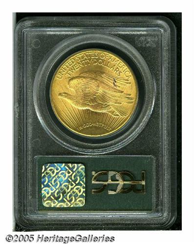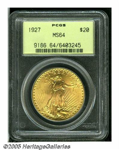 <B>1927<$20> MS64 PCGS.</B></I> Exquisitely toned with pink and apricot patina. A nicely struck example that has splendid luster and reasonably clean surfaces, for the grade. An interesting pair of dark, deep-purple spots, of unknown origin, reside on the upper right reverse, on the eagle's upper wing.