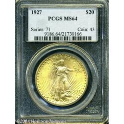 1927 $20 MS64 PCGS. Nicely struck with flashy lust <B>1927 $20 MS64 PCGS.</B></I> Nicely struck with flashy luster and pleasing apricot-gold patina. A couple of small abrasions are noted on Liberty's left leg and in the middle of the eagle's left wing. <BR><BR><B>Important notice:</B> Heritage usually auctions material at the rate of 200-250 lots per hour. On some occasions eBay Live bid software or the Internet may not be able to keep up with the pace of the auction. We recommend placing a realistic absentee bid now as insurance to avoid disappointment. Occasionally the auctioneer may eliminate or reject an eBay Live bid, and the auctioneer may also reopen a lot after the close of the eBay live bidding (usually because we missed an audience bid), and may reject your bid even if it shows you as the winning bidder. By bidding via eBay Live, you agree that Heritage may award the lot to another bidder at its sole discretion under the circumstances described above or any other reasonable circumstances. Since eBay bids are not shown to us until we open the lot on the floor, we treat those bids just like floor bids. In most cases the floor responds before the eBay bid is presented to us, due to Internet lag time, so for consistency we have made it a policy that floor bids are always considered first over tie eBay live bids. Also please note that all Heritage lots purchased through eBay Live carry a 20% Buyer's Premium. Please make sure you read the Terms and Conditions before you bid. This lot is being auctioned in conjunction with a live floor auction by Heritage Galleries & Auctioneers. All final auction and invoice information will be supplied by Heritage Galleries & Auctioneers, and all other information should be considered preliminary. Lot:7244
