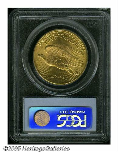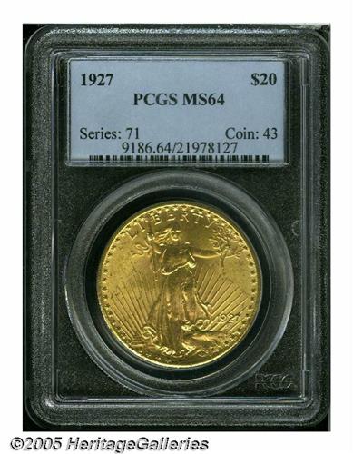 <B>1927<$20> MS64 PCGS.</B></I> Sharply struck with rich mint frost over both sides, and subtle variations of pink and green-gold toning. A handful of small abrasions are scattered over each side of the piece, preventing a higher grade.