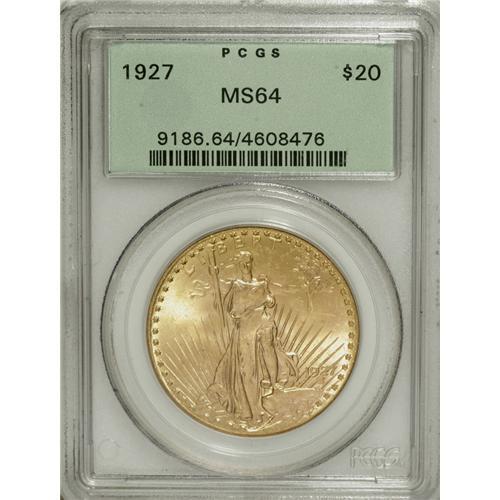 <B>1927 $20 MS64 PCGS.</B></I> This handsome Saint-Gaudens twenty has vibrant luster and blended aqua and apricot color. Crisply struck, well preserved, and encased in a green label holder.<BR><BR><b>Shipping:</b> Coins & Currency (<a target="_blank" href="http://www.heritageauctions.com/common/shipping.php">view shipping information</a>)
