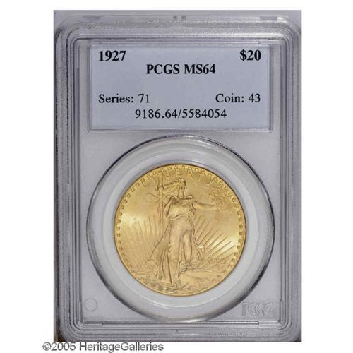 <B>1927<$20> MS64 PCGS.</B></I> Well defined with awesome luster and deep orange, rose, and steel-green color. There is a mentionable luster graze in the left obverse field, and a handful of minor contact marks are located on the reverse.<BR><I>From The Worth Bruntjen Collection.</B></I>