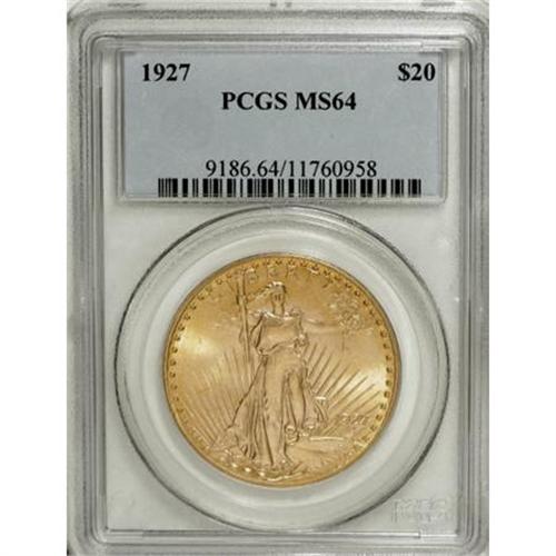 <B>1927 $20 MS64 PCGS.</B></I> PCGS Population (31941/21591). NGC Census: (42456/17652). Mintage: 2,946,750. Numismedia Wsl. Price for NGC/PCGS coin in MS64: $840. (#9186)<BR><BR><B>Coin Engraver:</B> Augustus Saint-Gaudens<BR><BR><b>Shipping:</b> Coins & Currency (<a target="_blank" href="http://www.heritageauctions.com/common/shipping.php">view shipping information</a>)