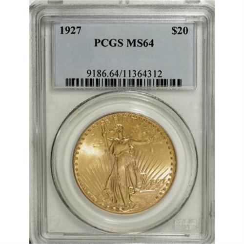 <B>1927 $20 MS64 PCGS.</B></I> PCGS Population (31941/21591). NGC Census: (42456/17652). Mintage: 2,946,750. Numismedia Wsl. Price for NGC/PCGS coin in MS64: $840. (#9186)<BR><BR><B>Coin Engraver:</B> Augustus Saint-Gaudens<BR><BR><b>Shipping:</b> Coins & Currency (<a target="_blank" href="http://www.heritageauctions.com/common/shipping.php">view shipping information</a>)