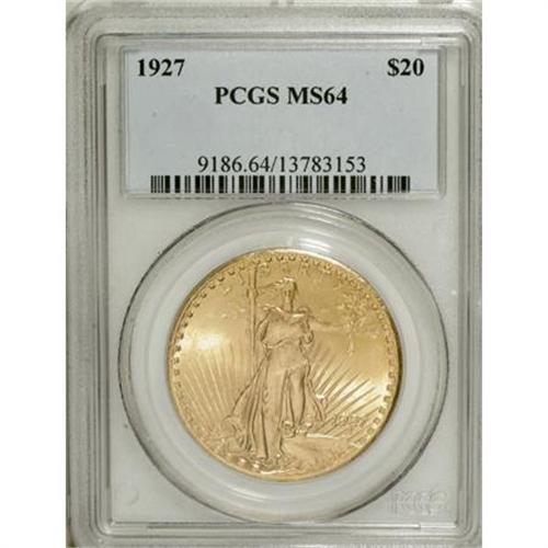 <B>1927 $20 MS64 PCGS.</B></I> PCGS Population (32358/21743). NGC Census: (42660/17757). Mintage: 2,946,750. Numismedia Wsl. Price for NGC/PCGS coin in MS64: $845. (#9186)<BR><BR><B>Coin Engraver:</B> Augustus Saint-Gaudens<BR><BR><b>Shipping:</b> Coins & Currency (<a target="_blank" href="http://www.heritageauctions.com/common/shipping.php">view shipping information</a>)