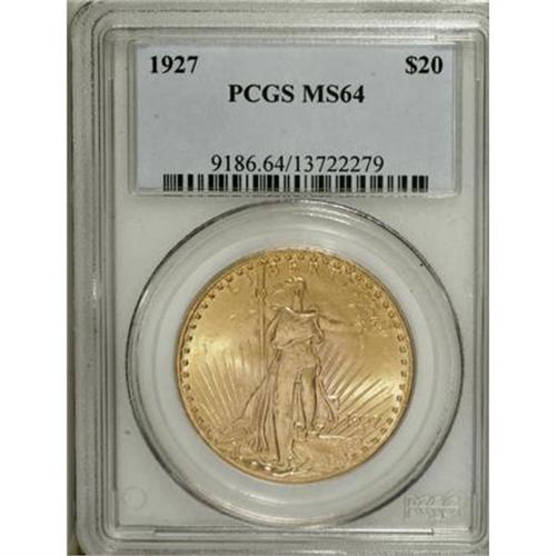 <B>1927 $20 MS64 PCGS.</B></I> PCGS Population (32390/22026). NGC Census: (42660/17757). Mintage: 2,946,750. Numismedia Wsl. Price for NGC/PCGS coin in MS64: $845. (#9186)<BR><BR><B>Coin Engraver:</B> Augustus Saint-Gaudens<BR><BR><b>Shipping:</b> Coins & Currency (<a target="_blank" href="http://www.heritageauctions.com/common/shipping.php">view shipping information</a>)