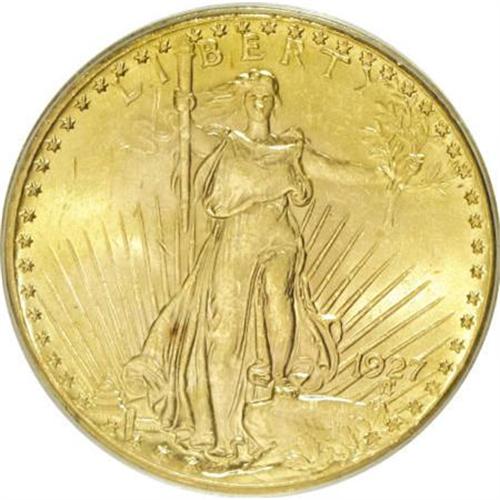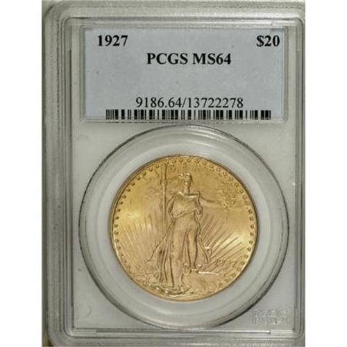 <B>1927 $20 MS64 PCGS.</B></I> PCGS Population (32390/22026). NGC Census: (42660/17757). Mintage: 2,946,750. Numismedia Wsl. Price for NGC/PCGS coin in MS64: $845. (#9186)<BR><BR><B>Coin Engraver:</B> Augustus Saint-Gaudens<BR><BR><b>Shipping:</b> Coins & Currency (<a target="_blank" href="http://www.heritageauctions.com/common/shipping.php">view shipping information</a>)