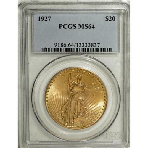<B>1927 $20 MS64 PCGS.</B></I> PCGS Population (33312/22955). NGC Census: (42922/17967). Mintage: 2,946,750. Numismedia Wsl. Price for NGC/PCGS coin in MS64: $845. (#9186)<BR><BR><B>Coin Engraver:</B> Augustus Saint-Gaudens<BR><BR><b>Shipping:</b> Coins & Currency (<a target="_blank" href="http://www.heritageauctions.com/common/shipping.php">view shipping information</a>)