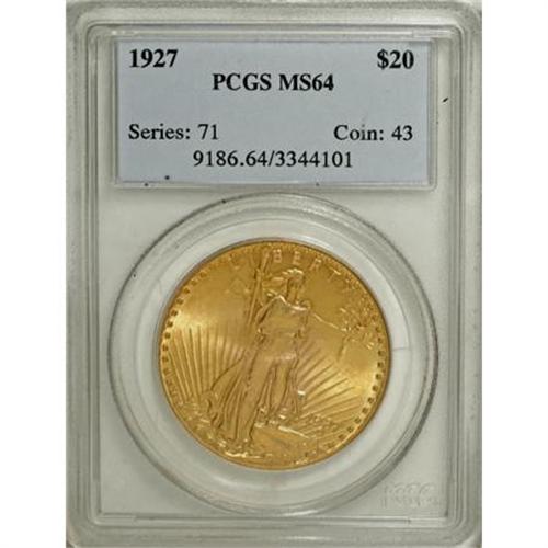 <B>1927 $20 MS64 PCGS.</B></I> PCGS Population (33289/22941). NGC Census: (42922/17967). Mintage: 2,946,750. Numismedia Wsl. Price for NGC/PCGS coin in MS64: $845. (#9186)<BR><BR><B>Coin Engraver:</B> Augustus Saint-Gaudens<BR><BR><b>Shipping:</b> Coins & Currency (<a target="_blank" href="http://www.heritageauctions.com/common/shipping.php">view shipping information</a>)