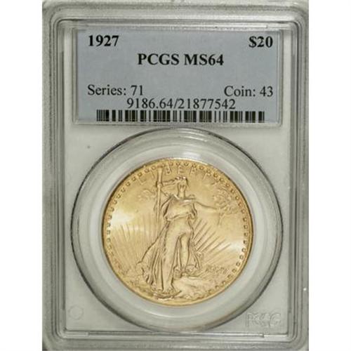 <B>1927 $20 MS64 PCGS.</B></I> PCGS Population (34262/23939). NGC Census: (43419/18192). Mintage: 2,946,750. Numismedia Wsl. Price for NGC/PCGS coin in MS64: $1,210. (#9186)<BR><BR><B>Coin Engraver:</B> Augustus Saint-Gaudens<BR><BR><b>Shipping:</b> Coins & Currency (<a target="_blank" href="http://www.heritageauctions.com/common/shipping.php">view shipping information</a>)