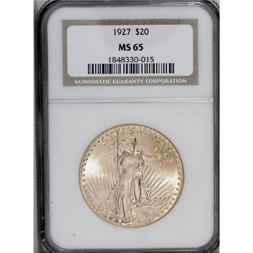 <B>1927<$20> MS65 NGC.</B></I> A nicely struck wheat-gold double eagle that has distinct apricot accents. The surfaces are well-preserved with vibrant luster, which makes this piece an excellent candidate for a type set.