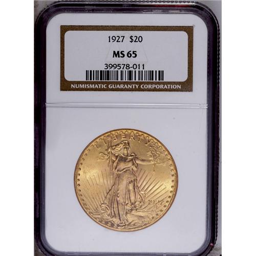 <B>1927<$20> MS65 NGC.</B></I> Booming luster and lovely lime and orange tints ensure the originality. The fields and devices are well preserved, while the rims have a few moderate marks.