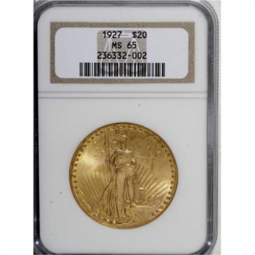 <B>1927 $20 MS65 NGC.</B></I> NGC Census: (15891/1715). PCGS Population (16635/4475). Mintage: 2,946,750. Numismedia Wsl. Price for NGC/PCGS coin in MS65: $1,230. (#9186)<BR><BR><B>Coin Engraver:</B> Augustus Saint-Gaudens<BR><BR><b>Shipping:</b> Coins & Currency (<a target="_blank" href="http://www.heritageauctions.com/common/shipping.php">view shipping information</a>\)