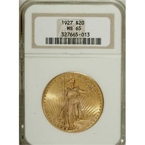 <B>1927 $20 MS65 NGC.</B></I> Both sides of this Gem are awash in luster, and have received an attentive strike. Apricot-gold surfaces are minimally abraded.<BR><BR><B>Coin Engraver:</B> Augustus Saint-Gaudens<BR><BR><b>Shipping:</b> Coins & Currency (<a target="_blank" href="http://www.heritageauctions.com/common/shipping.php">view shipping information</a>)