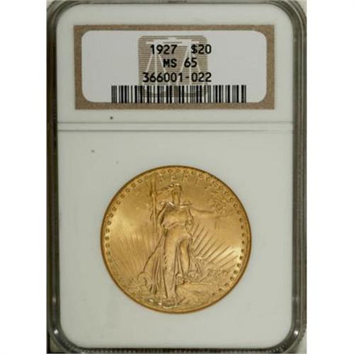 <B>1927 $20 MS65 NGC.</B></I> Golden-tan patination rests on the radiantly lustrous surfaces of this attractive, well struck Gem. A few luster grazes do not disturb.<BR><BR><B>Coin Engraver:</B> Augustus Saint-Gaudens<BR><BR><b>Shipping:</b> Coins & Currency (<a target="_blank" href="http://www.heritageauctions.com/common/shipping.php">view shipping information</a>)