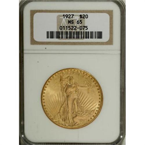 <B>1927 $20 MS65 NGC.</B></I> Peach-gold surfaces display hints of light green, and radiate pleasing luster. Well struck and nicely preserved.<BR><BR><B>Coin Engraver:</B> Augustus Saint-Gaudens<BR><BR><b>Shipping:</b> Coins & Currency (<a target="_blank" href="http://www.heritageauctions.com/common/shipping.php">view shipping information</a>)