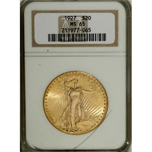 <B>1927 $20 MS65 NGC.</B></I> Bright luster exudes from the yellow-gold surfaces of this well struck Gem. A few minute contact marks occur over each side. The NGC holder is cracked at the bottom of both sides.<BR><BR><B>Coin Engraver:</B> Augustus Saint-Gaudens<BR><BR><b>Shipping:</b> Coins & Currency (<a target="_blank" href="http://www.heritageauctions.com/common/shipping.php">view shipping information</a>)